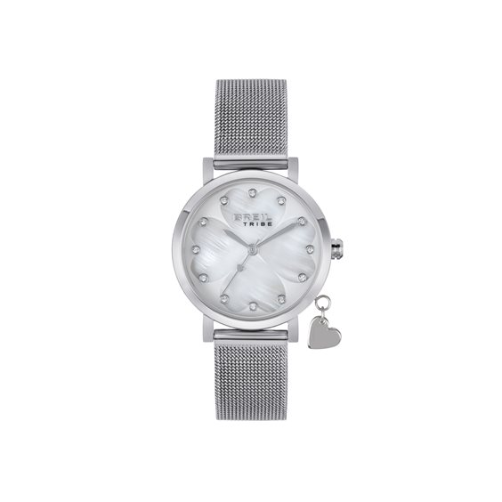 L'orologio solo tempo Emily ha una cassa in acciaio lucido, abbinata a un quadrante di madre perla che ricrea la forma di un quadrifoglio. Lucenti cristalli agli indici illuminano questo orologio rendendolo estremamente glam insieme al charm a forma di cuore posto a ore 4.