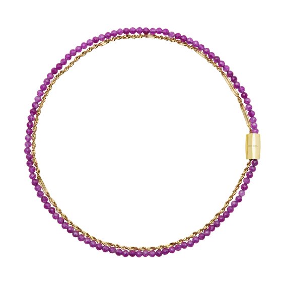 Il girocollo Purple Orchid abbina una sottile catena ritorta in acciaio lucido color oro a un filo di pietre naturali (agata viola) .