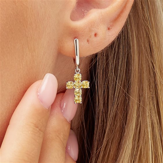 Orecchino singolo in argento rodiato 925‰ con pendente a forma di croce e cushion cubic zirconia colore golden yellow.